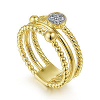 This multi-row ring is an effortless shortcut to a stylish ring stack. The top row is crafted with a twisted rope texture and features a circular cluster of 0.08ct diamonds. The middle row showcases smooth polished gold, while the bottom row boasts sophisticated Bujukan beads. Get three-in-one style with this 14K yellow gold ring.