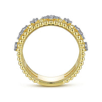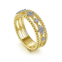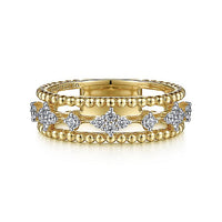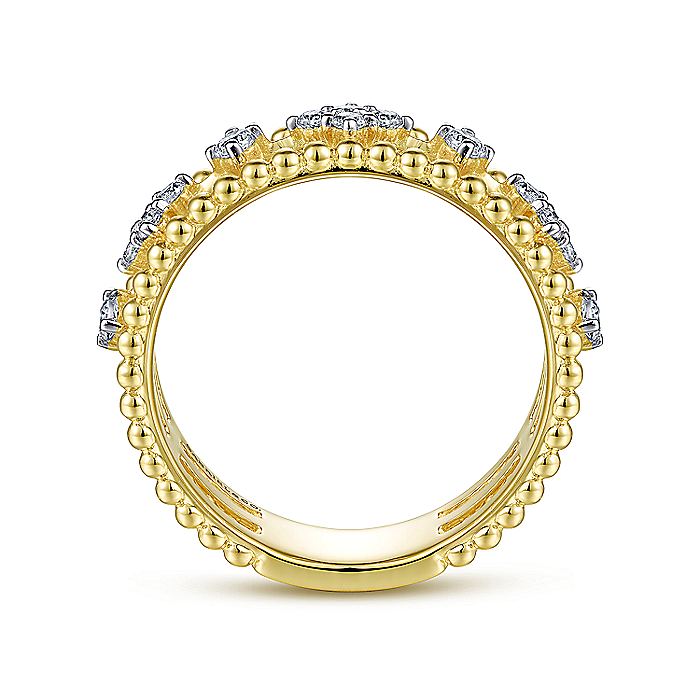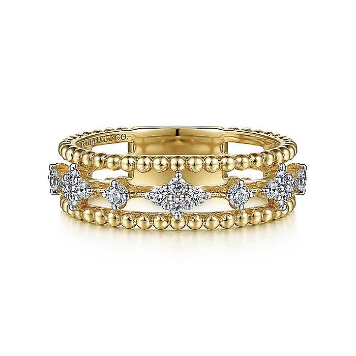 Gleaming spheres of 14K yellow gold run along the outer bands of this triple layer fashion ring, creating signature Bujukan sophistication. The central band features radiant diamond stations, alternating between individual stones and larger clusters. The 0.29ct diamond stations are secured with coordinating 14K white gold prongs.