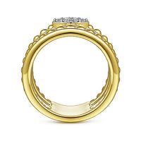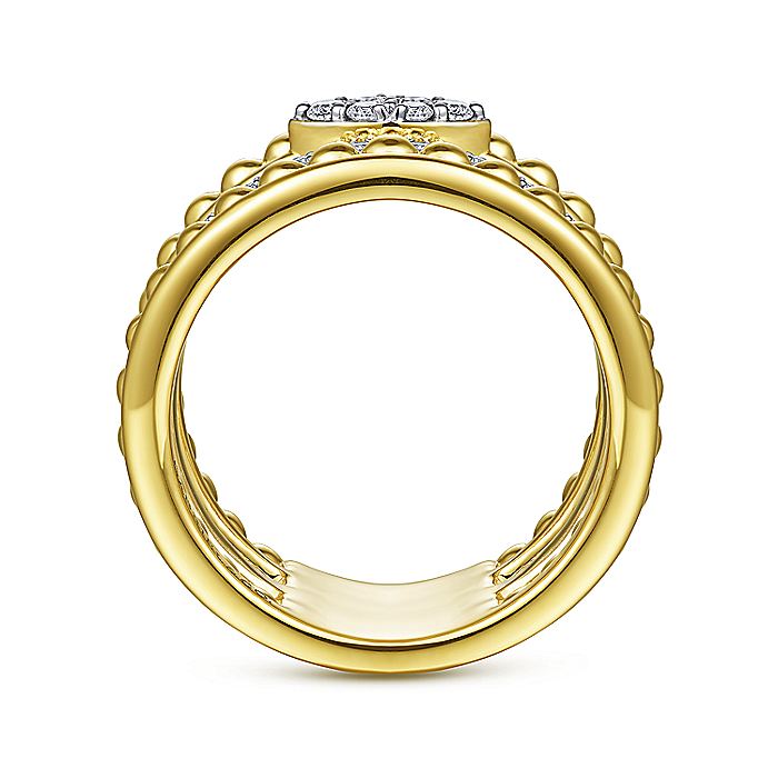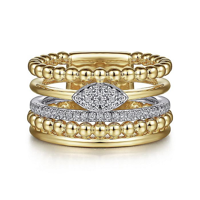 This wide band ring is your effortless shortcut to an enviable ring stack. Brilliant 0.23ct accent diamonds are set in cool 14K white gold across a straight band and marquise shaped cluster. The balance of the ring is constructed in warm 14K yellow gold, including beaded spheres that nod to our signature Bujukan collection.