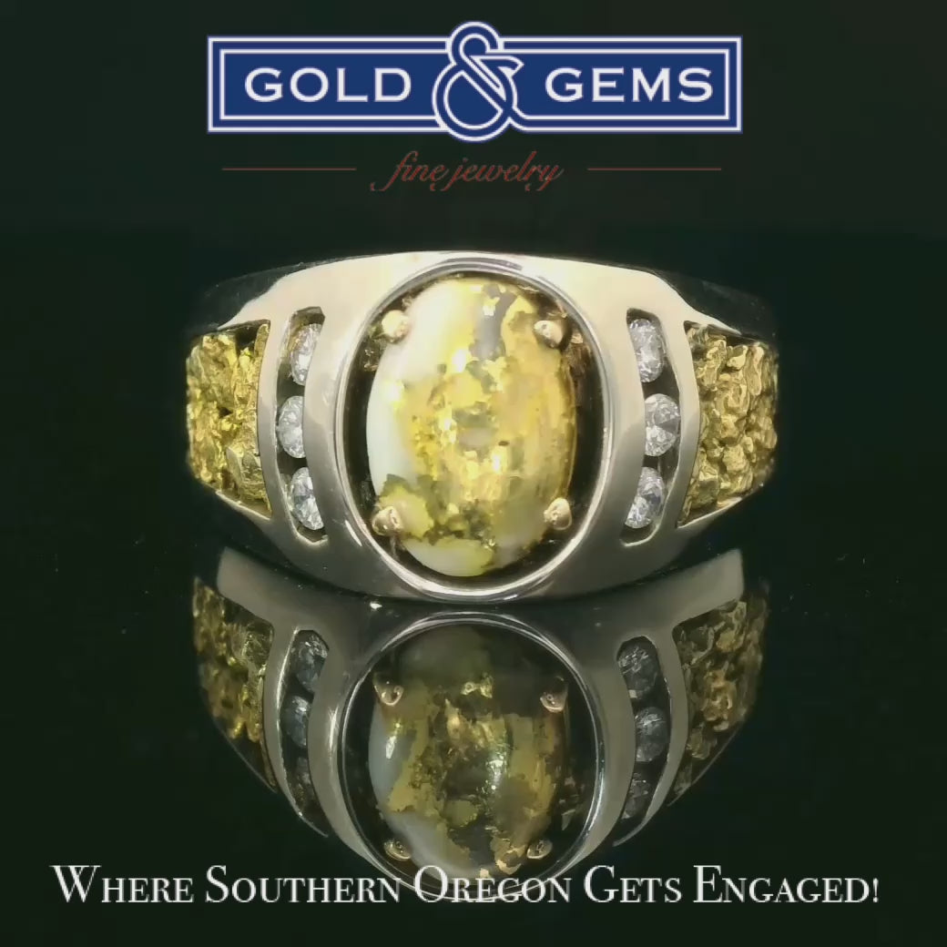 Discover the allure of this stunning 14k White gold ring, featuring natural gold nugget as found in the River a captivating, Rare Oval Cabachon Cut Gold Quartz in the center. Surrounded by sparkling diamonds, this gorgeous ring is perfect for adding a touch of elegance to any outfit. Its unique design makes it a standout accessory for both casual and formal occasions. You can own a rare specimen of real Gold Quartz today!