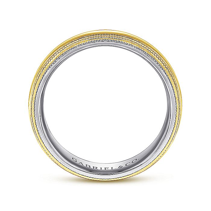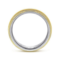 Commemorate your marriage vows with this two tone men's wedding band featuring 14K yellow gold on the outside and 14K white gold on the inside. The metal colors meet on the edges of the ring in refined milgrain borders.