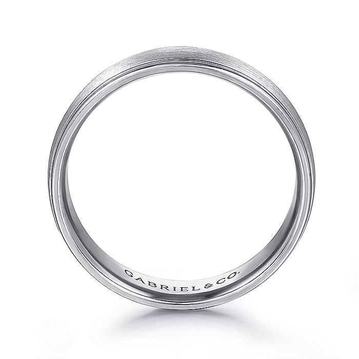 A stylish wedding ring with modern details, this men's band features a satin finish bordered by two smooth, polished edges. This 14K white gold ring features a rounded shape that's comfortable to wear.