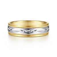 HOME / Gabriel & Co. MBM0119-60M4JJJ 14K White-Yellow 6mm - Engraved Center and Millgrain Channel Men's Wedding Band