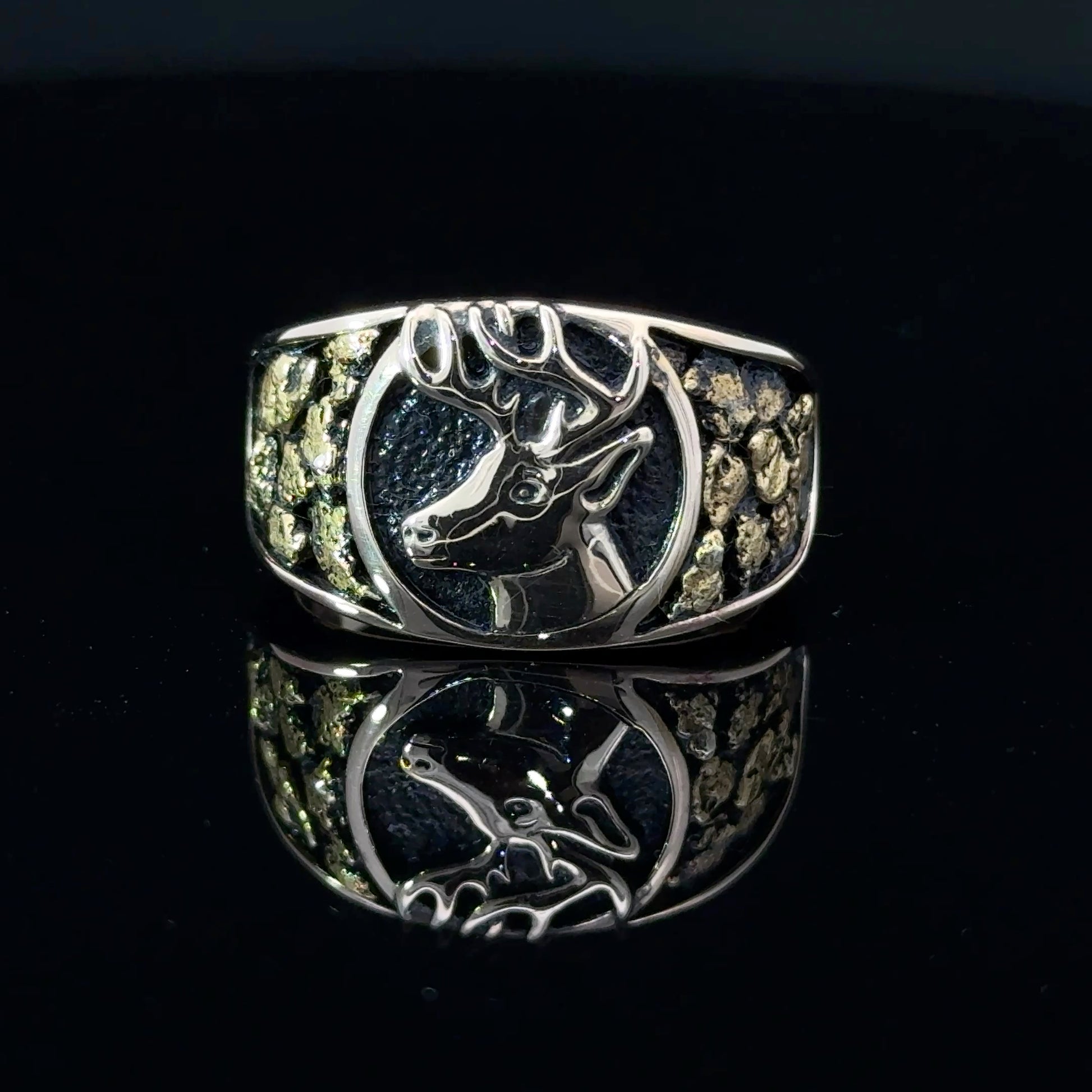 Discover the beauty of nature with this exquisite gold ring featuring a detailed deer design and side panels filled with natural gold nuggets as found in the river. The intricate craftsmanship highlights the majestic creature, making it a perfect accessory for nature lovers. Wear it as a statement piece or a subtle reminder of the wild.