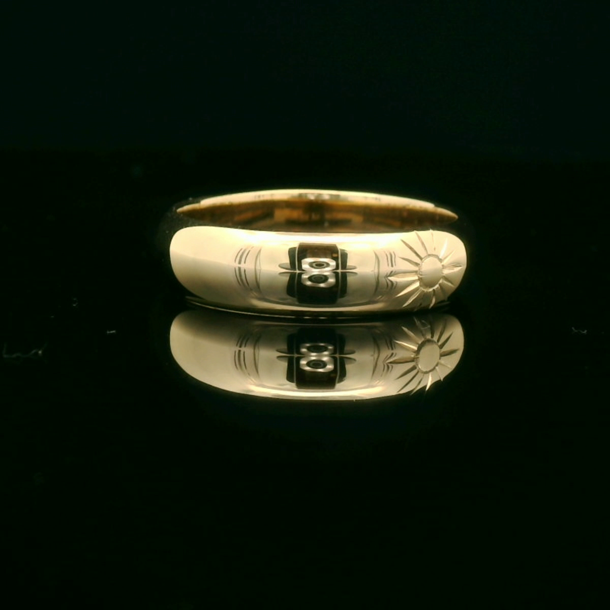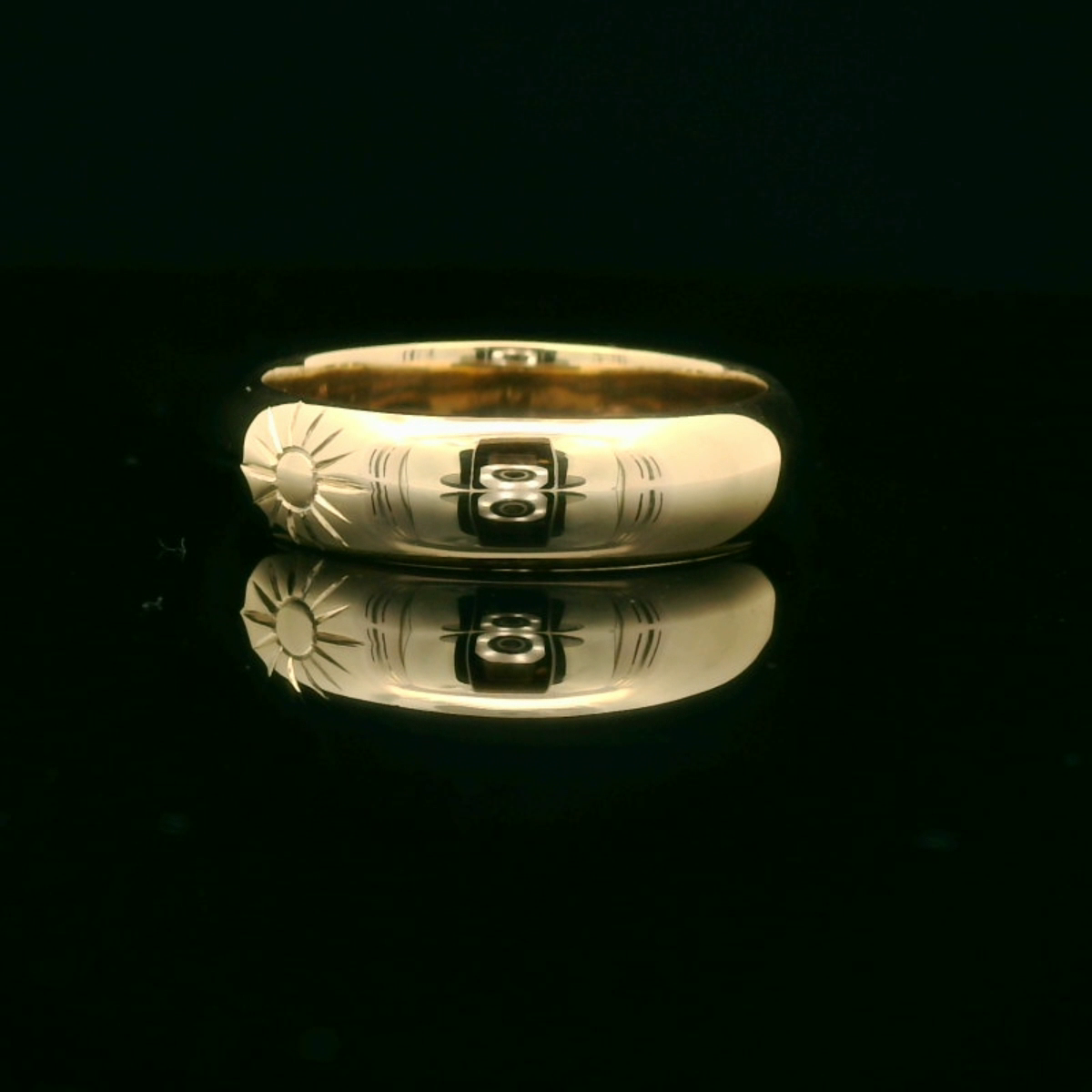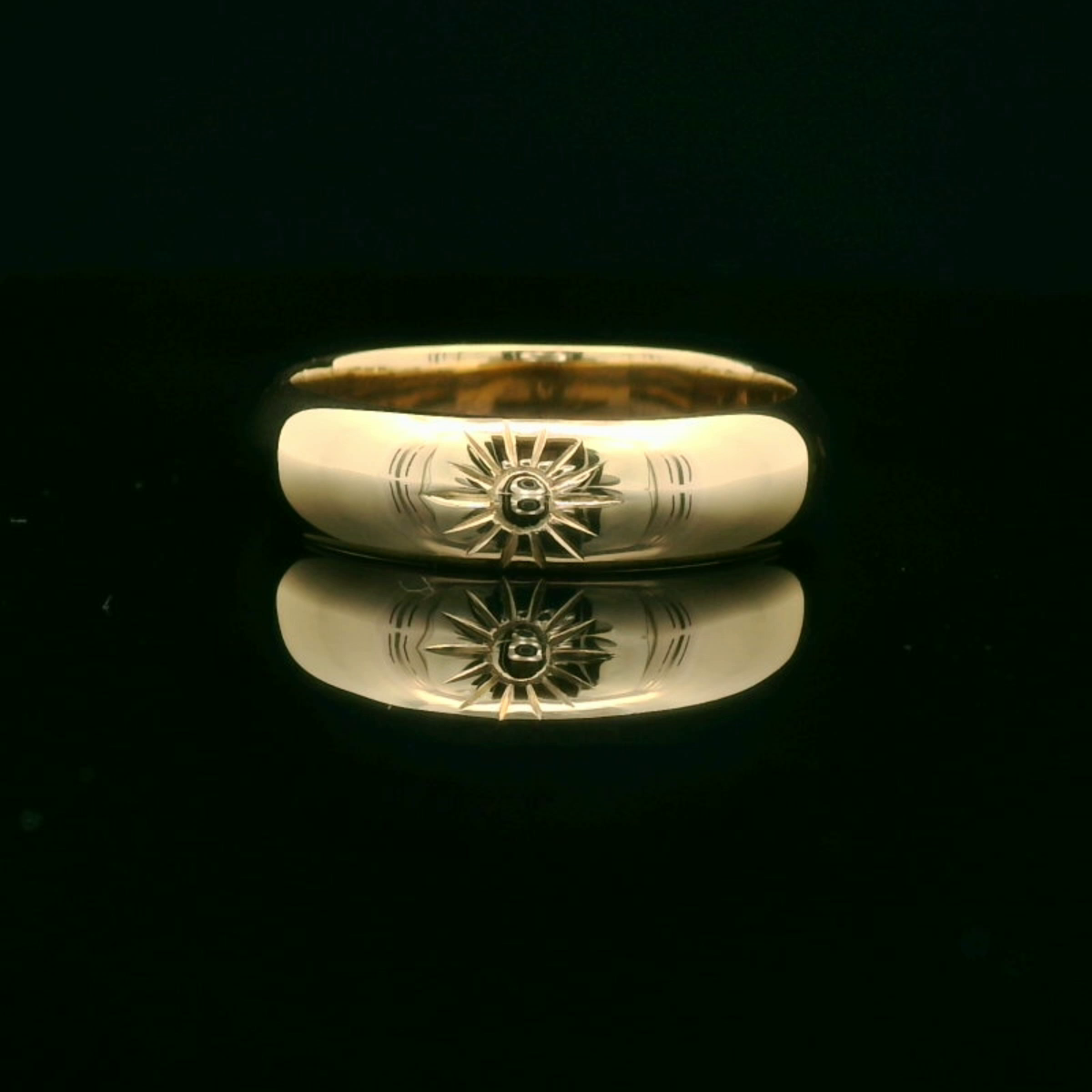 Discover the beauty of this unique gold ring, featuring a subtle hand engraved sunburst design that adds a touch of spiritual resonance. Its polished finish reflects light beautifully, making it a stunning ring for the lovers of the sun and light.