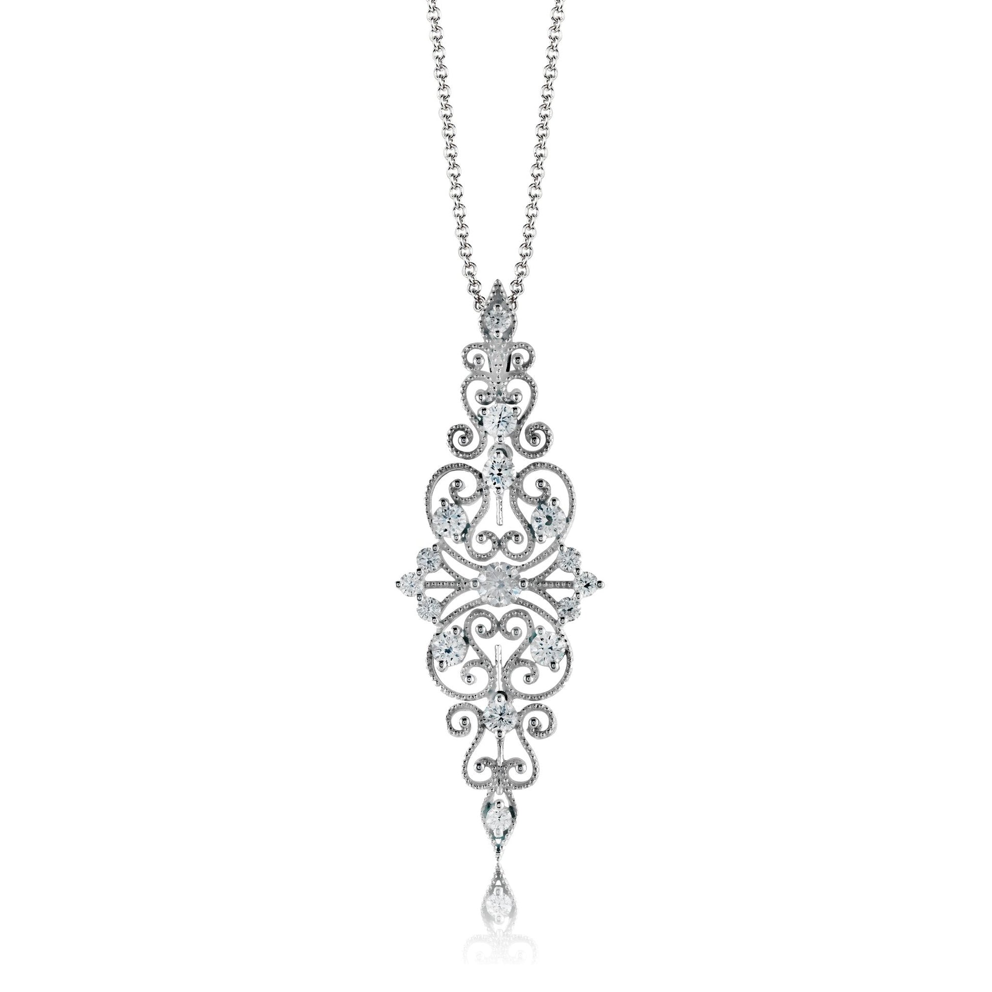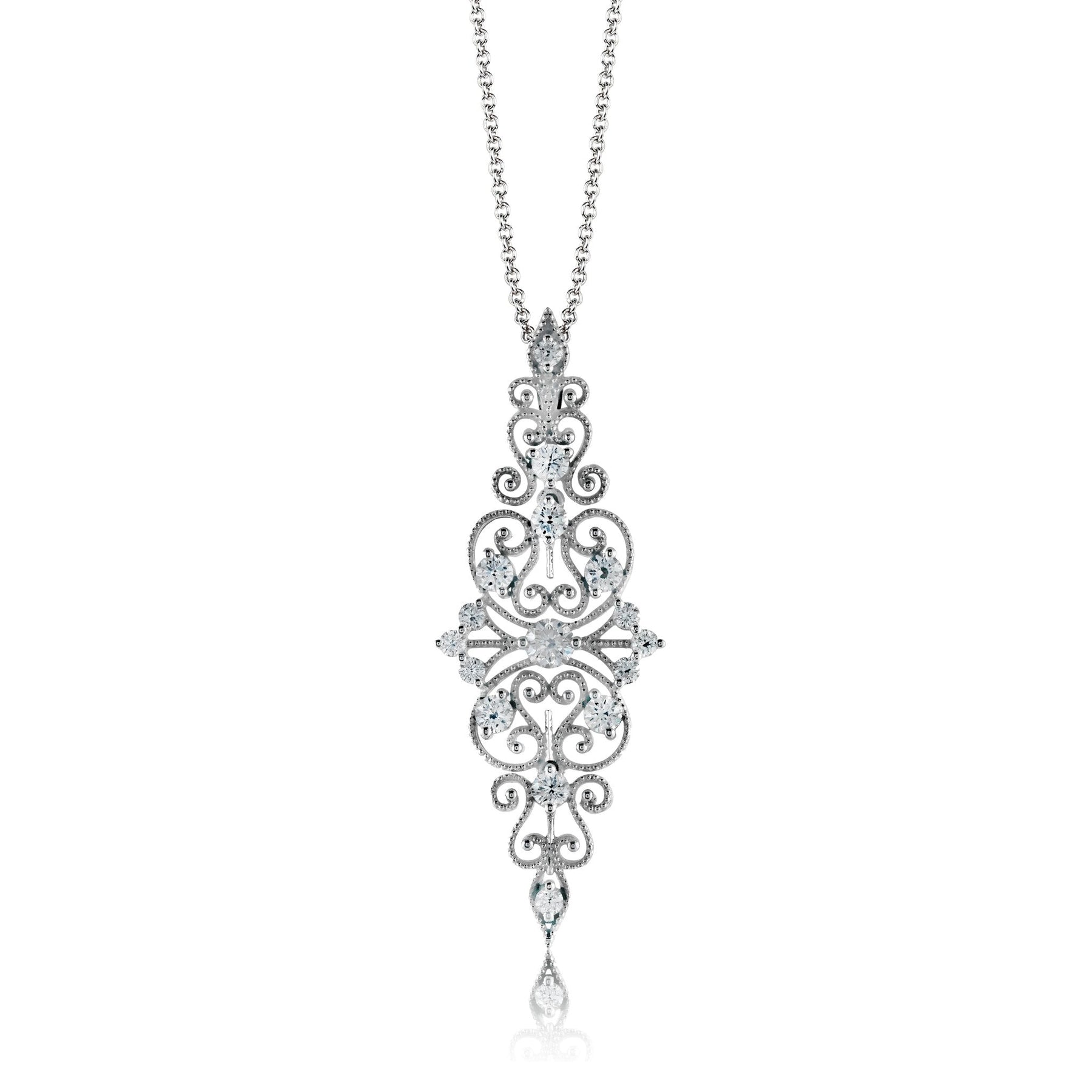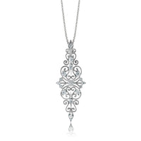 This stunning pendant features an intricate, filigree design and is adorned with sparkling white diamonds.