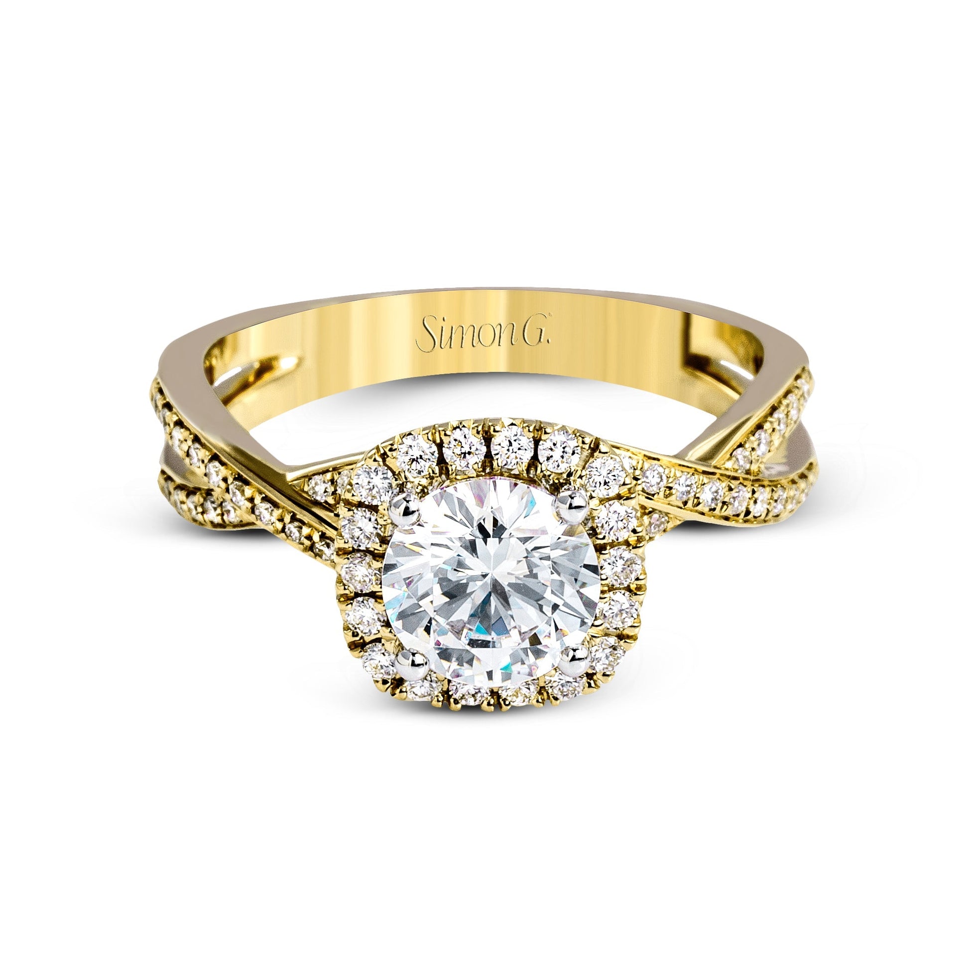 Round-cut Halo Criss-cross Engagement Ring in 18k Gold with Diamonds