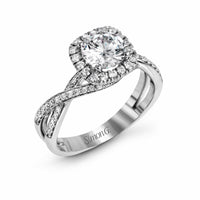 This sparkling, modern engagement ring features an eye-catching twist design with an elegant halo accented by shimmering white diamonds.