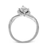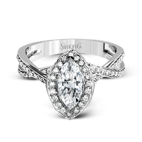 This dazzling engagement ring features a unique twist design and a sparkling diamond halo.