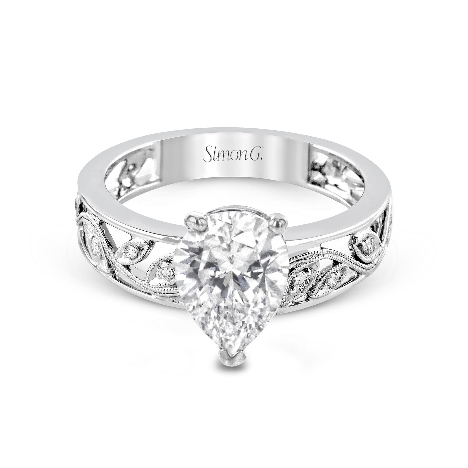 This vintage-style engagement ring features a delicate floral design accented by shimmering white diamonds.