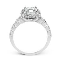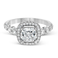 The delicate design of this classic engagement ring features a sparkling pavé-set halo accented by shimmering round white diamonds.