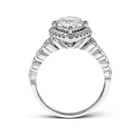 The delicate design of this classic engagement ring features a sparkling pavé-set halo accented by shimmering round white diamonds.