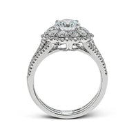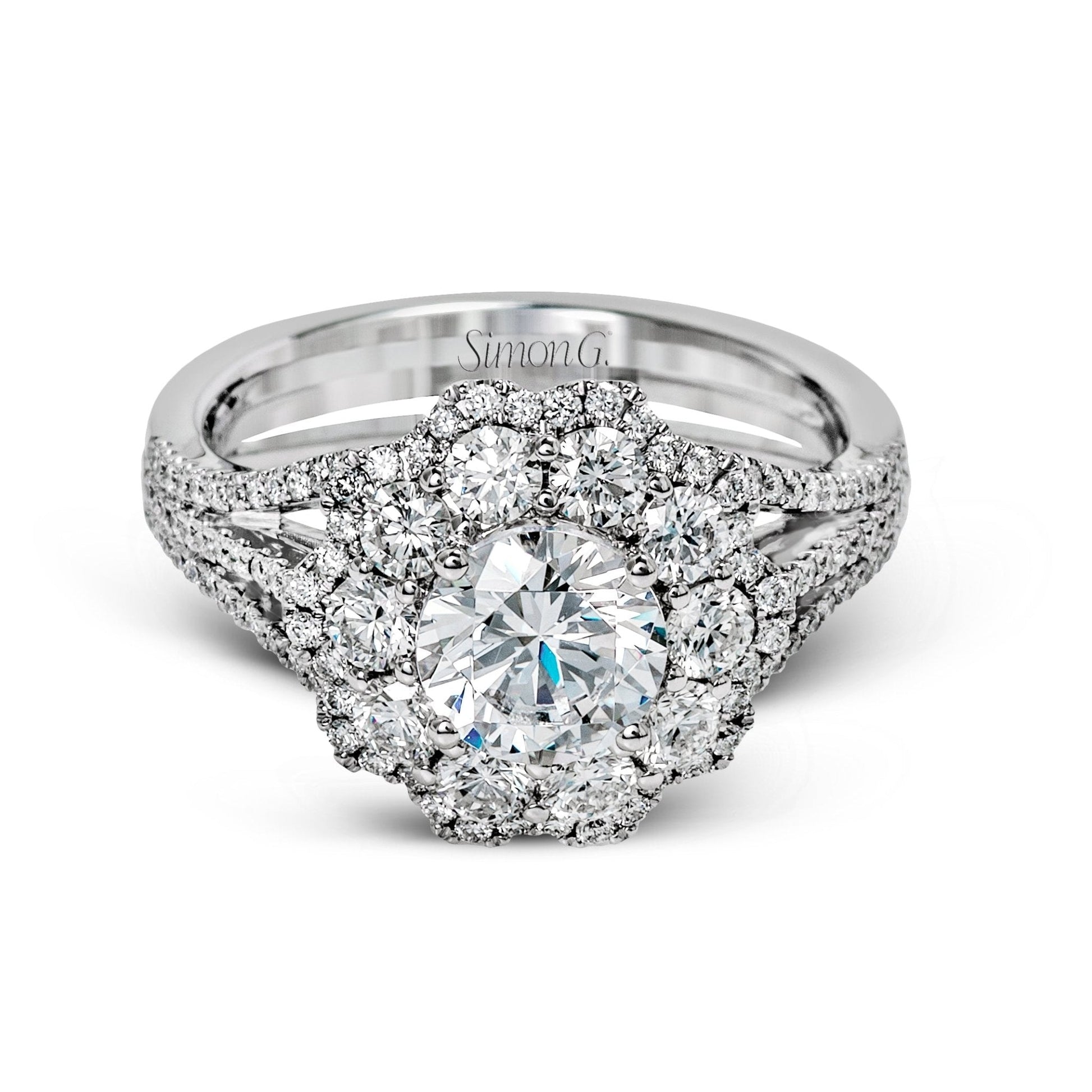 This lovely, modern engagement ring features an eye-catching halo and is adorned with shimmering diamonds.