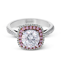 This beautiful ring features a double-halo design and is adorned with sparkling white and pink diamonds.