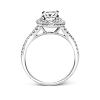 This beautiful, classic-style engagement ring features a double-halo design and shimmers with round white diamonds.