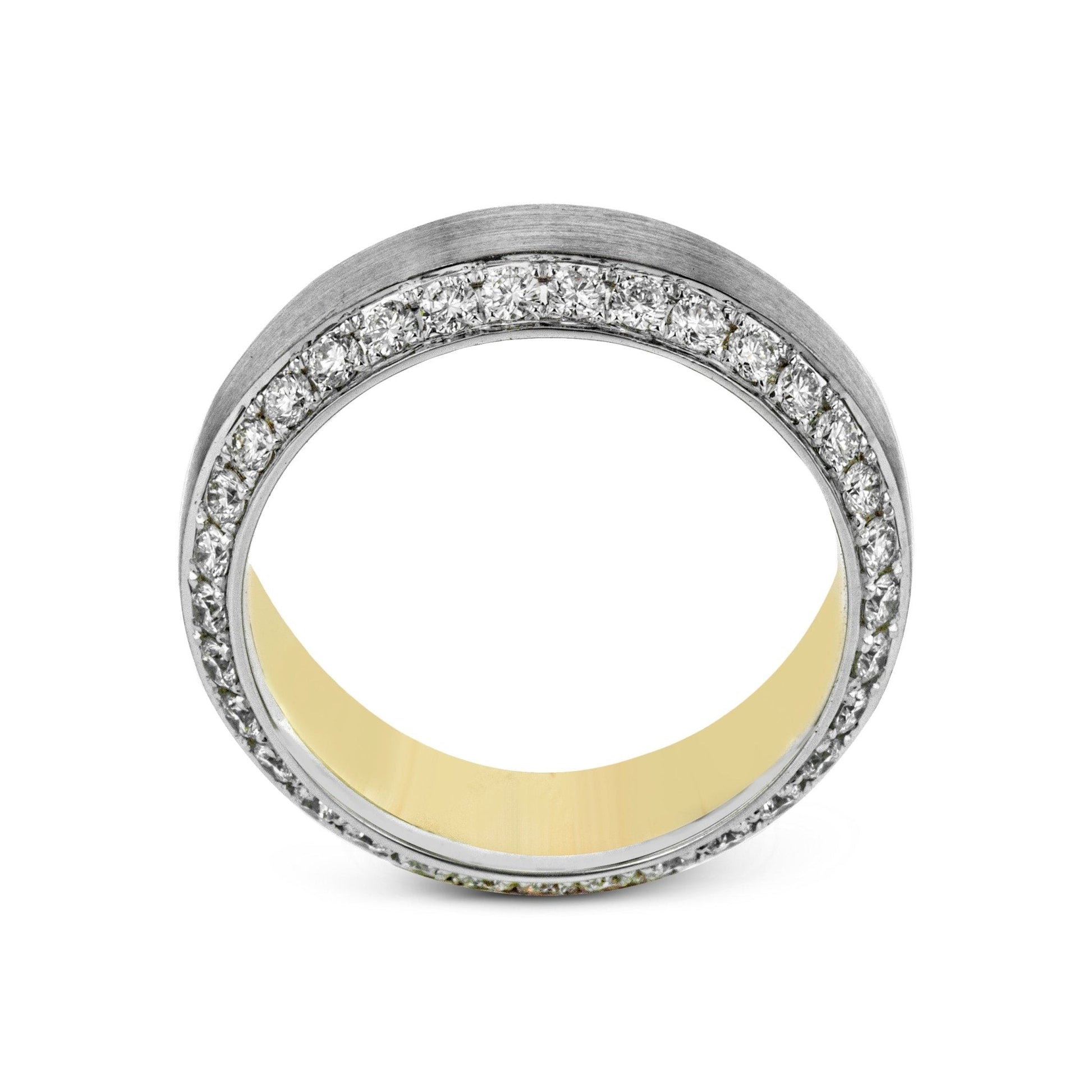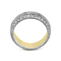 This sublimely beautiful wedding band features a brushed exterior and edges lined with white diamonds.
