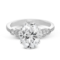 This stunning engagement ring features sparkling oval and round diamond side stones as well as diamond accents along the shank.