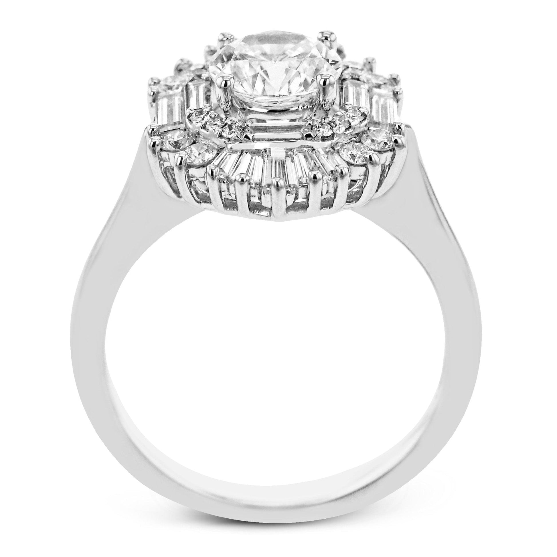 This distinctive ring is an ode to Art Deco design and features .23 ctw of round diamonds in its halo along with a burst of .70 ctw of baguette diamonds.