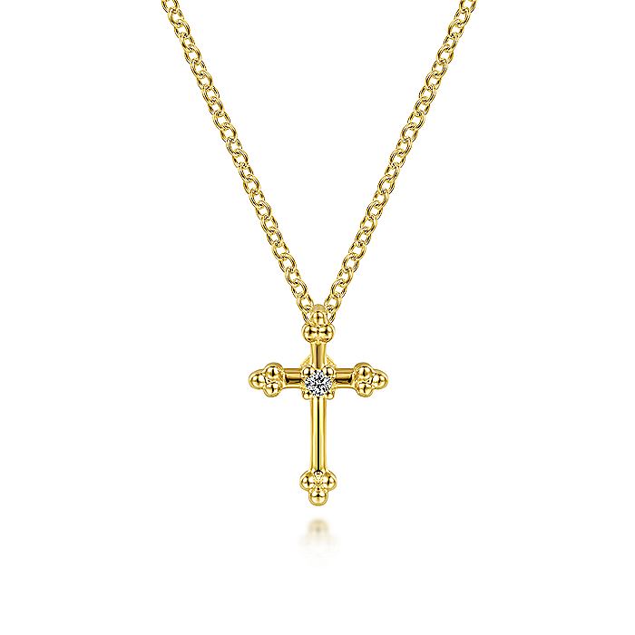A delicate pendant style, this 14K yellow gold cross is accented with polished gold beading at each of its four points. A petite prong-set .01 ct diamond rests in the center gleaming brightly.