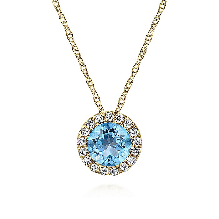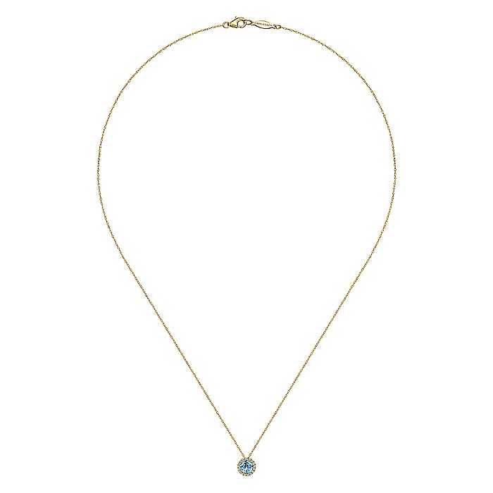 HOME / Gabriel & Co. NK2824Y45BT 14K Yellow Gold Round Swiss Blue Topaz and Diamond Halo Pendant Necklace