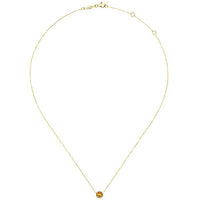 A round citrine gemstone radiates with brilliant honey gold colors. Encompassed with a .04 ct diamond halo accent, this 14K yellow gold pendant style necklace is a subtle statement with positive attributes of citrine.