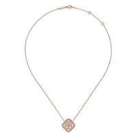 Stylish flourishes and chic cutouts characterize this luxurious 14k rose gold necklace. The openwork pendant is punctuated by 0.35cts of radiant pavé diamonds. A slim cable chain caps off this romantic design.