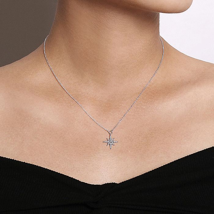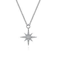 This darling necklace features a shining starbust pendant covered in .25cts of radiant pavé diamonds. She'll be over the moon for this heavenly 14k white gold fashion necklace. Day or night, this eye-catching diamond necklace is the perfect way to complete your outfit.