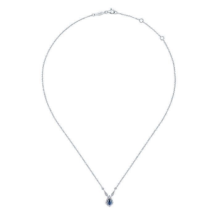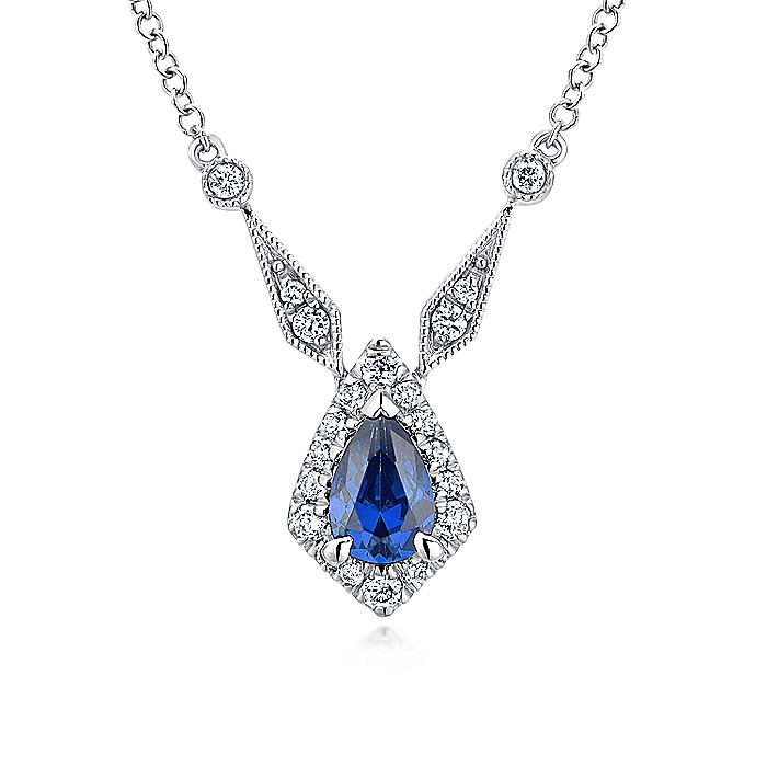 HOME / Gabriel & Co. NK5292W45SA Vintage Inspired 14K White Gold Teardrop Sapphire and Diamond Halo Pendant Necklace