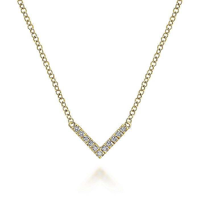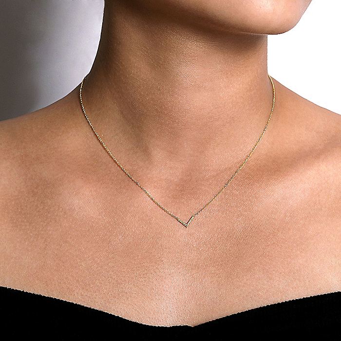 A petite statement necklace is all you ever need. This 14K yellow gold bar style features an appreciation for angles and diamonds. The bar is shaped into a V shape and is adorned with .05 ct diamonds making it a chic and subtle jewelry piece.