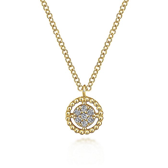 A cluster of .05ct round pavé diamonds sparkles at the heart of this delicate everyday necklace. A lustrous circle of beaded 14k yellow gold appears to float around the glittering diamonds. You'll never want to take this delicate fashion necklace off.