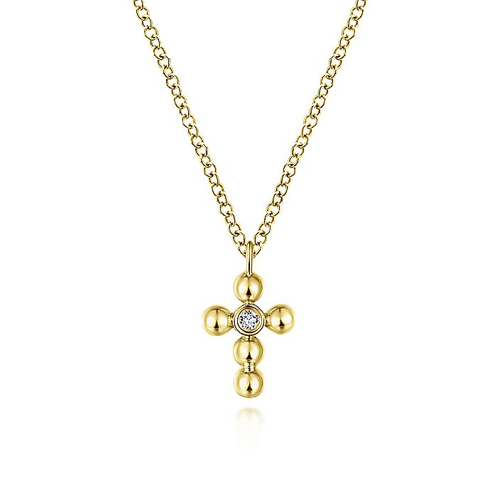 Add this shining symbol of faith to your everyday jewelry collection. Five polished 14k yellow gold beads are fused to create a timeless cross silhouette. At the center, a single 0.01ct bezel set round diamond provides perfectly calibrated sparkle.