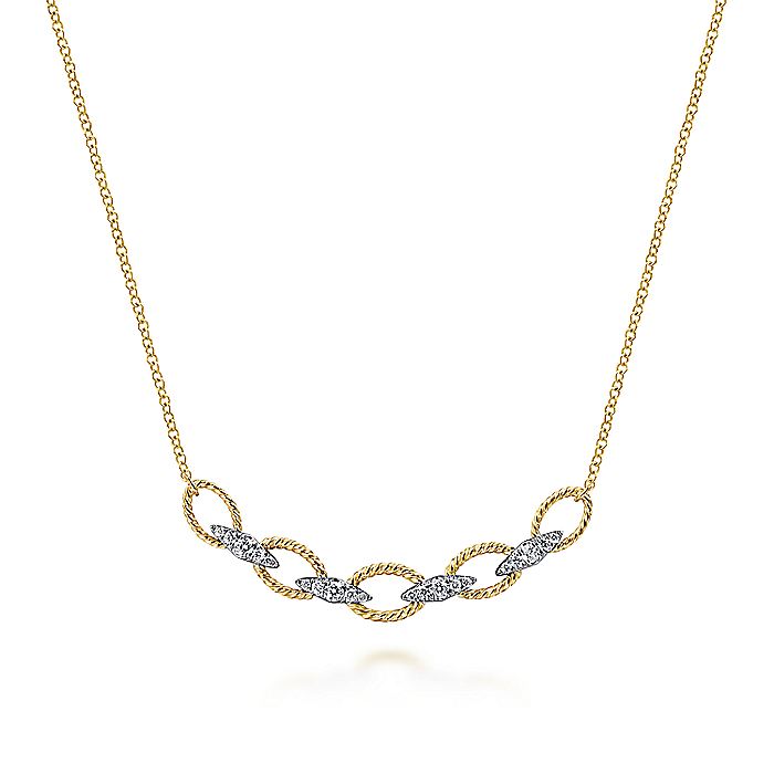 A timeless chain link design adorns this 14k yellow and white gold fashion necklace. Loops of twisted yellow gold are joined by brilliant kite shaped diamond links. Crafted with the utmost attention to detail, this classic 0.24ct diamond necklace is an heirloom quality piece.