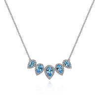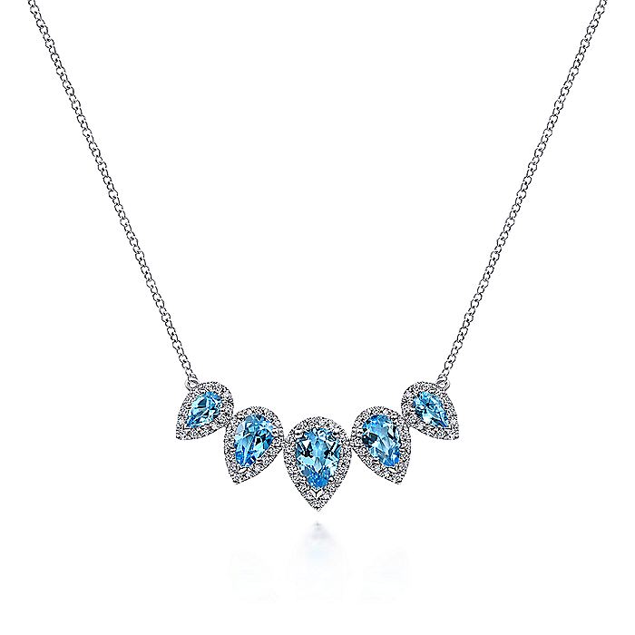 HOME / Gabriel & Co. NK6079W45BT Graduating 14K White Gold Pear Shaped Blue Topaz and Diamond Halo Necklace