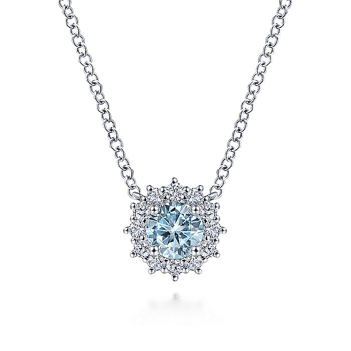 HOME / Gabriel & Co. NK6143W45AQ 18 inch 14K White Gold Round Aquamarine and Diamond Halo Pendant Necklace