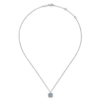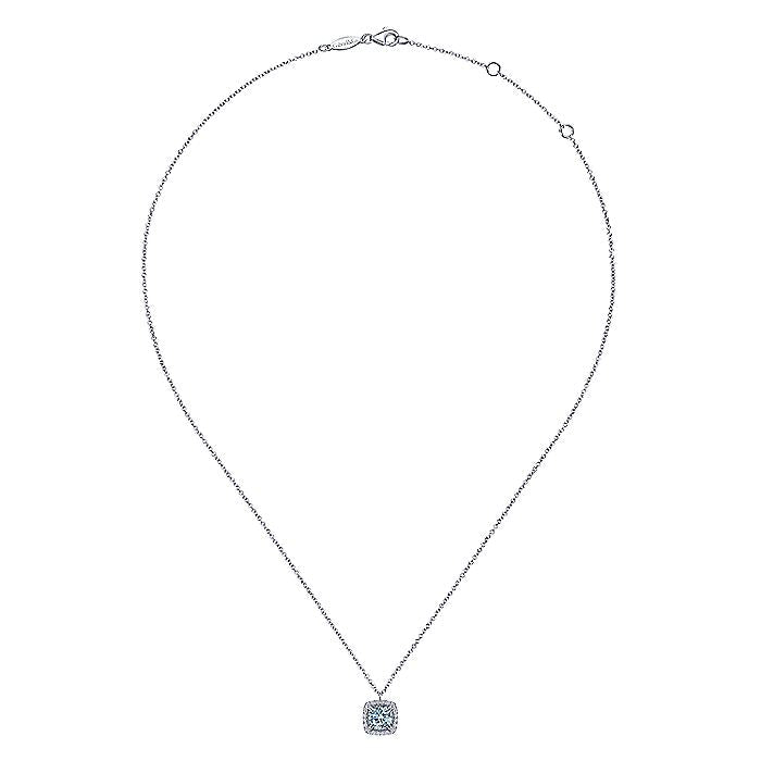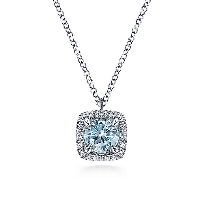 HOME / Gabriel & Co. NK6144W45AQ 14K White Gold Round Aquamarine and Cushion Diamond Halo Pendant Necklace