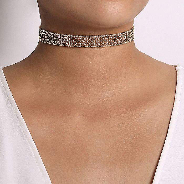 HOME / Gabriel & Co. NK6209Y45JJ 14K Yellow Gold Wide Diamond Station Choker Necklace with Bujukan Beads