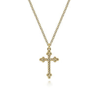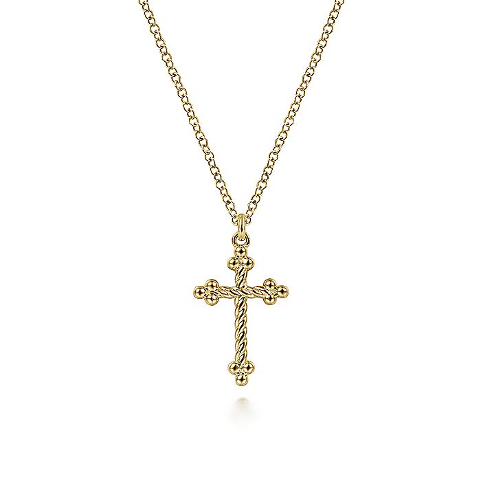 A petite statement of royal caliber, this gorgeous cross pendant showcases 14K yellow gold that twists gently in a coiling motion throughout the shape. Accented with dainty bead accents, this symbolic emblem is a must for your jewelry collection.