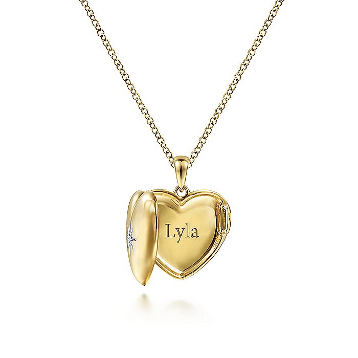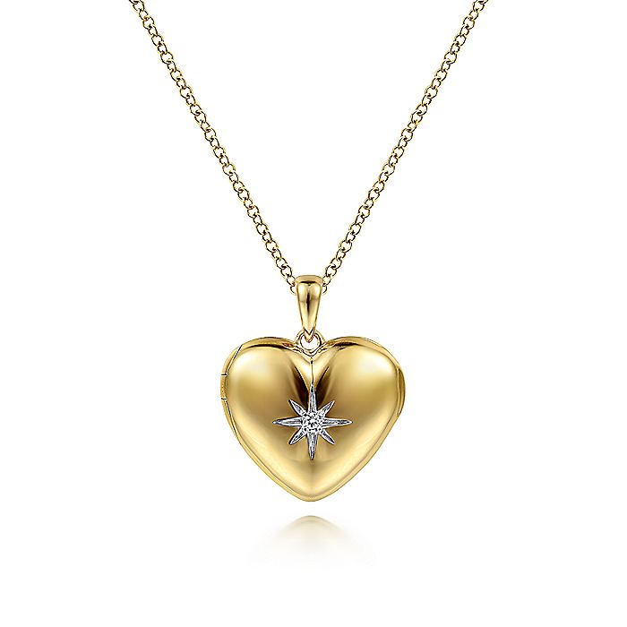 Youthful yet traditional, this locket necklace is composed of polished 14K yellow gold crafted into a rotund heart shape. Adding a subtle sparkle, a .01 ct diamond twinkles brightly at its center in a brilliant starburst shape.