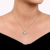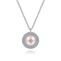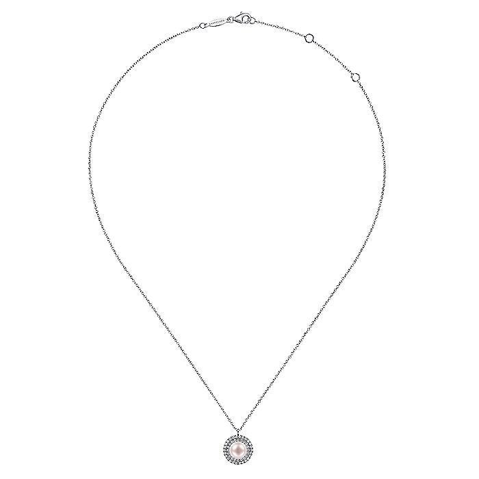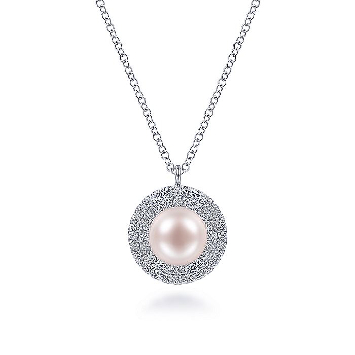 HOME / Gabriel & Co. NK6633W45PL 14K White Gold Round Pearl and Diamond Halo Pendant Necklace