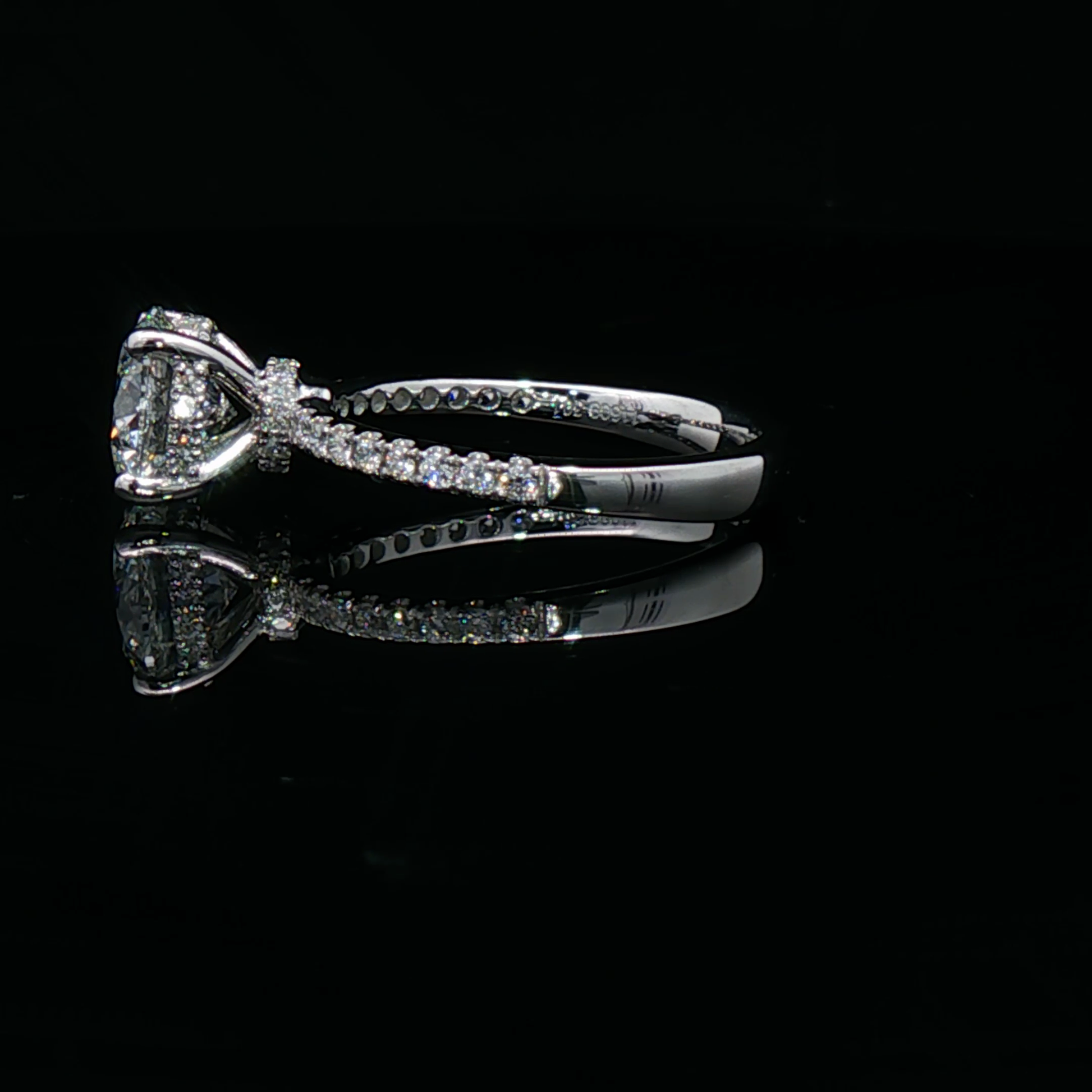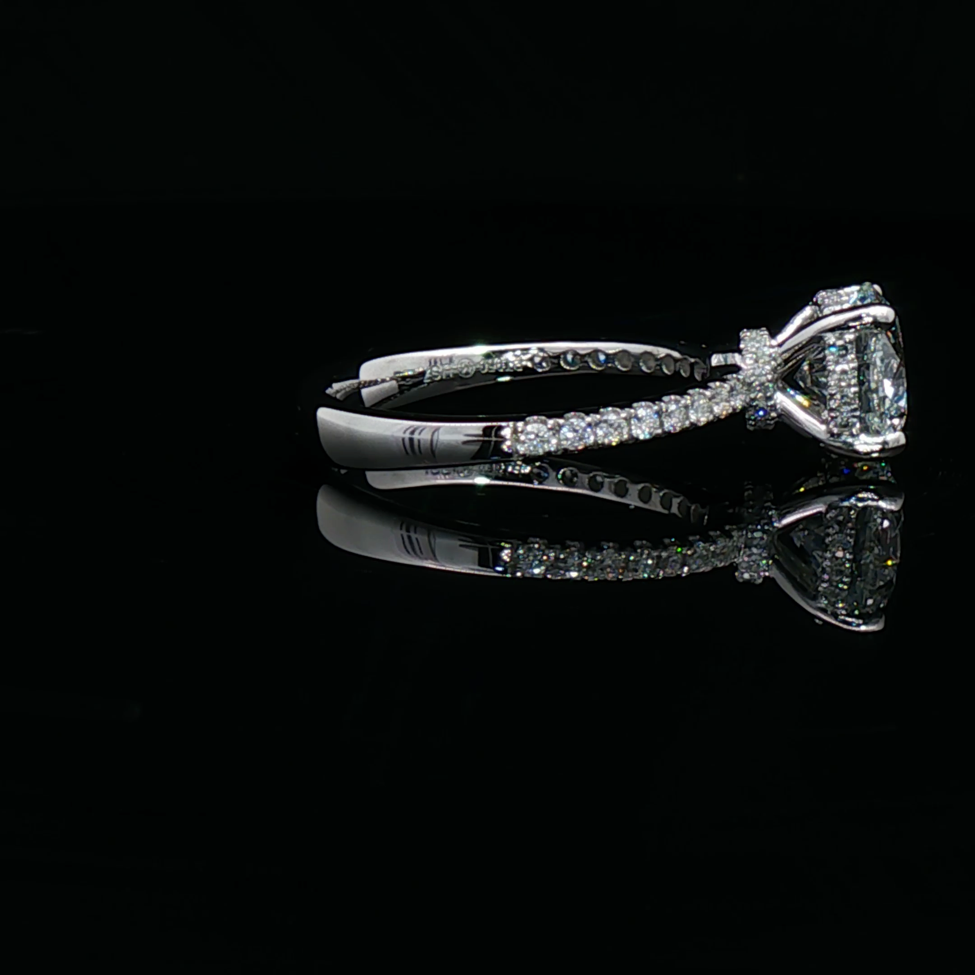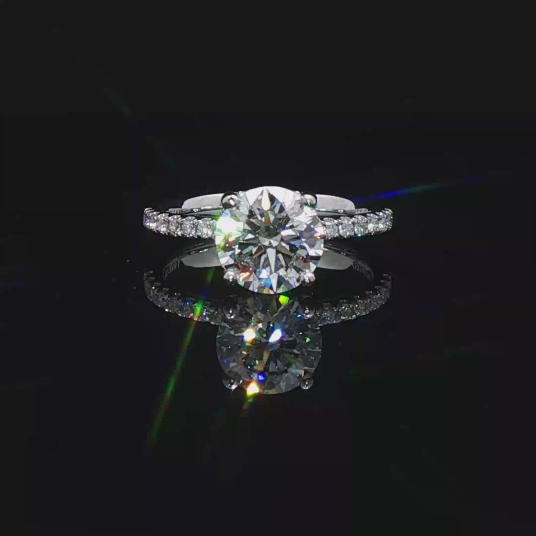 Exquisite engagement ring featuring a stunning 2.01ct round UltraFire™ diamond in the center, known for its exceptional brilliance. The diamond is meticulously set in a platinum setting with 0.31cttw of diamonds. This timeless piece exudes sophistication and elegance, perfect for celebrating a lifetime of love.