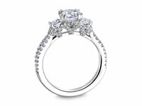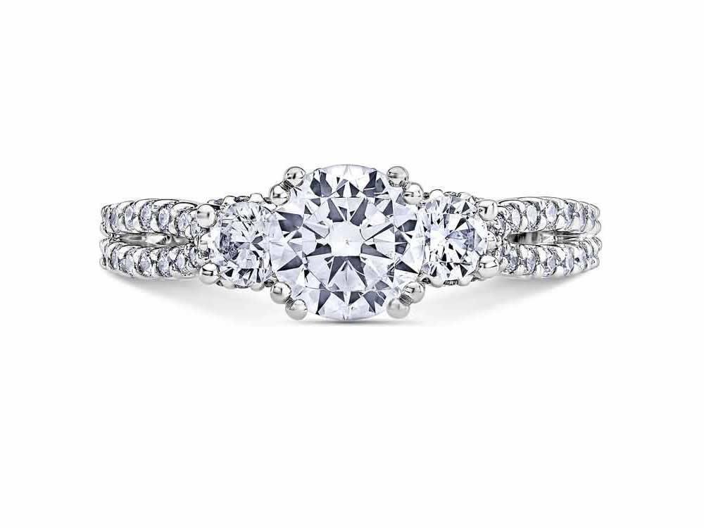 Engagement ring with round diamonds flanking center stone and diamond split shank