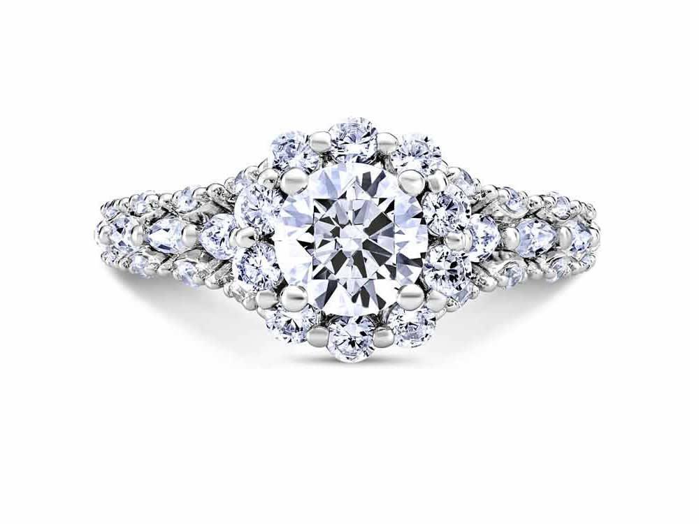 Engagement ring with round diamond halo and marquise and round diamonds down the shank