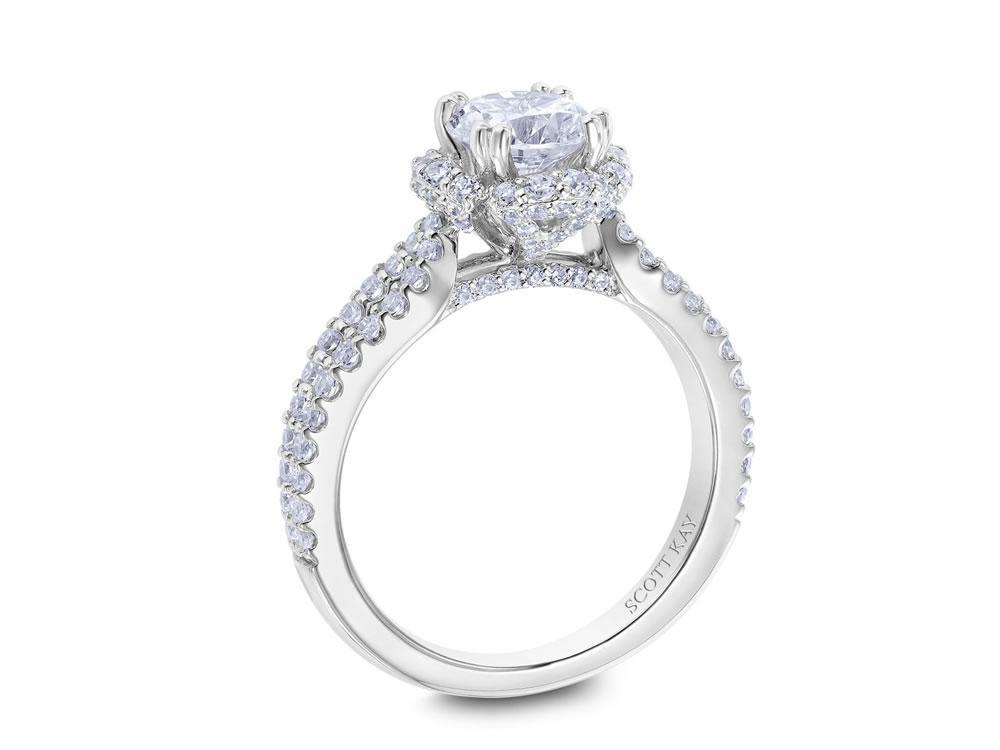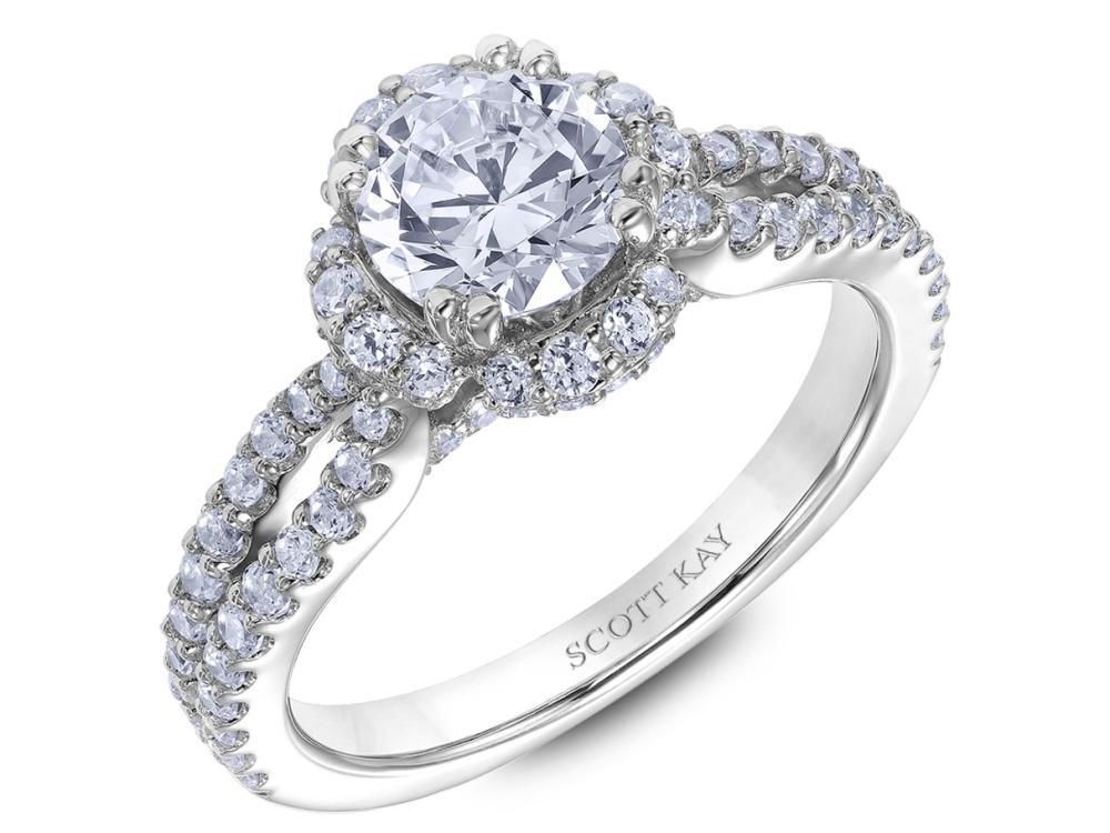 Engagement ring with round diamond halo and split shank with a diamond accented profile