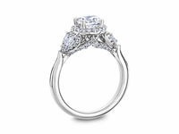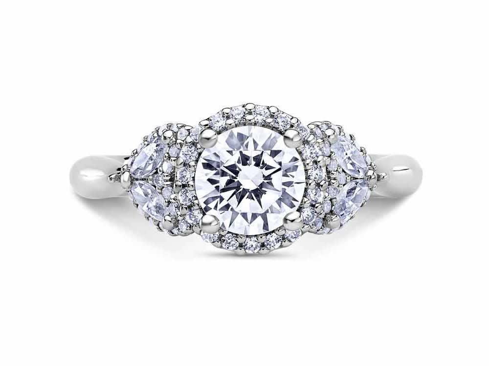 Engagement ring with round diamond halo and marquise and round diamond shank