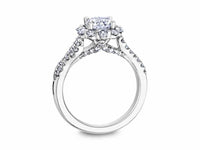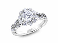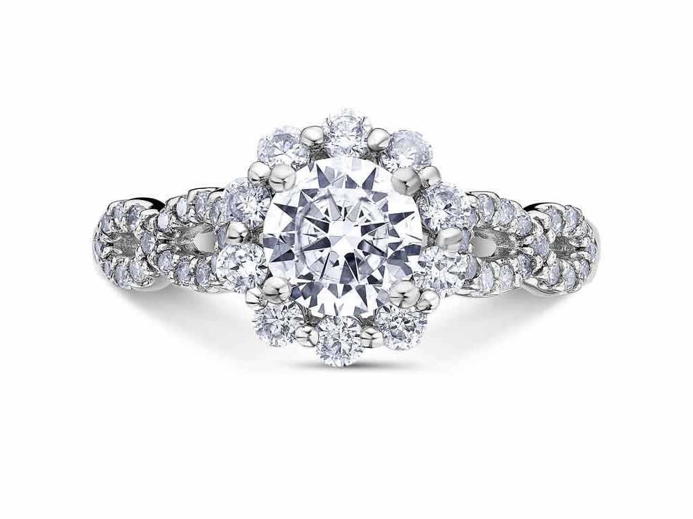 Engagement ring with round diamond halo and open twist diamond shank with diamond namaste detail in the gallery