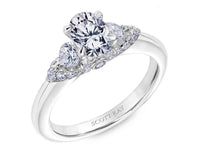 Three stone engagement ring with round diamonds flanking center stone and diamonds on the profile