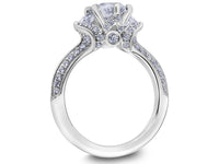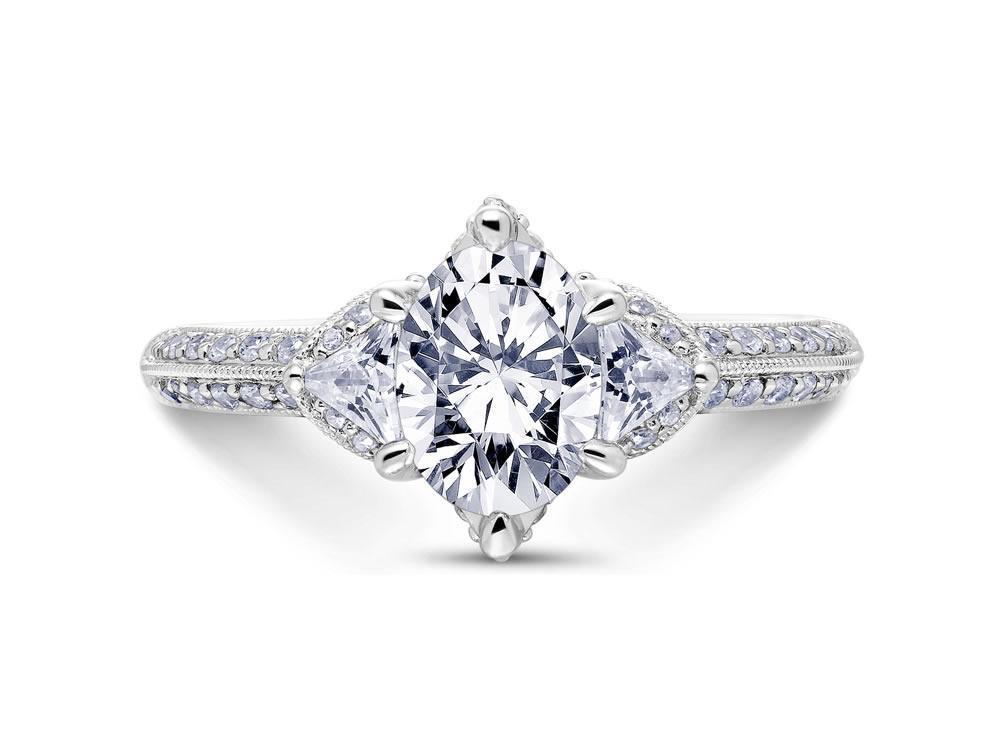 Three stone engagement ring with trillions and diamond shoulders and a milgrain accented knife edge diamond shank