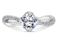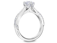 Engagement ring with a diamond accented split shank and diamond prongs with a namaste detail in the gallery