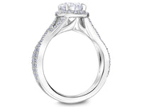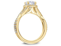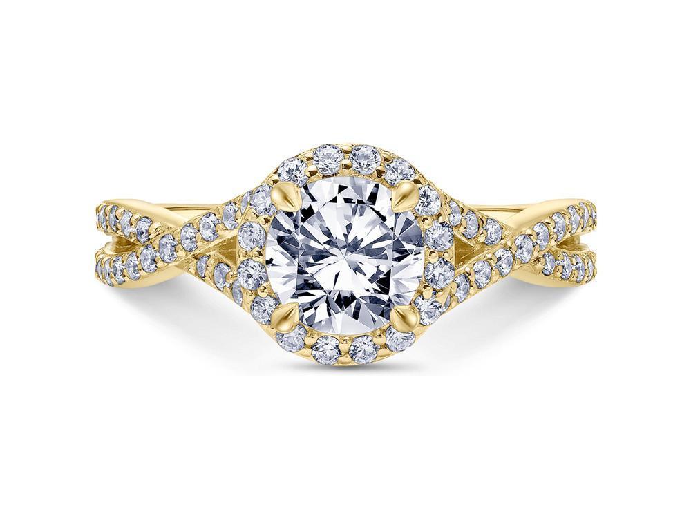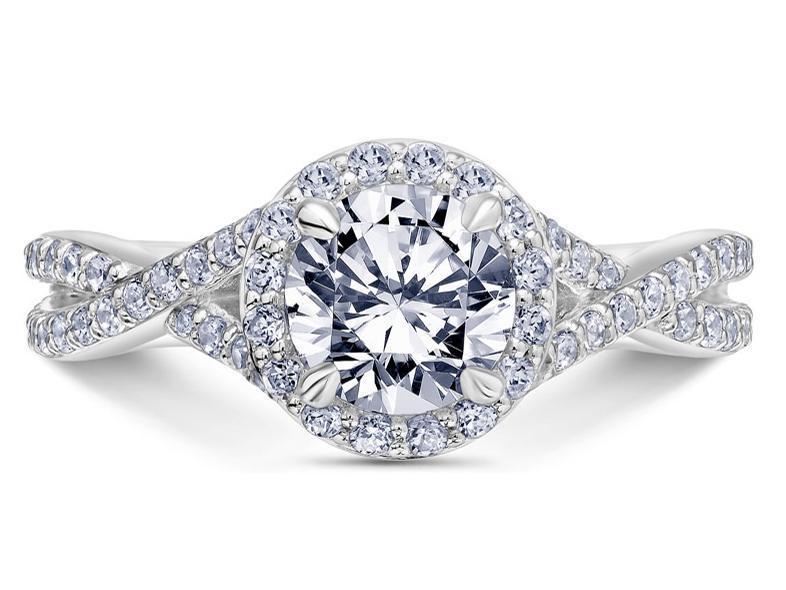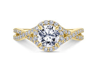 Engagement ring with a round diamond halo and diamond twist shank with namaste gallery