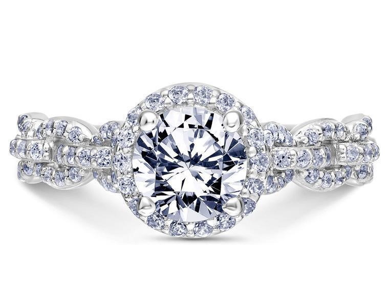 Engagement ring with round diamond halo and diamond encrusted links down the shank